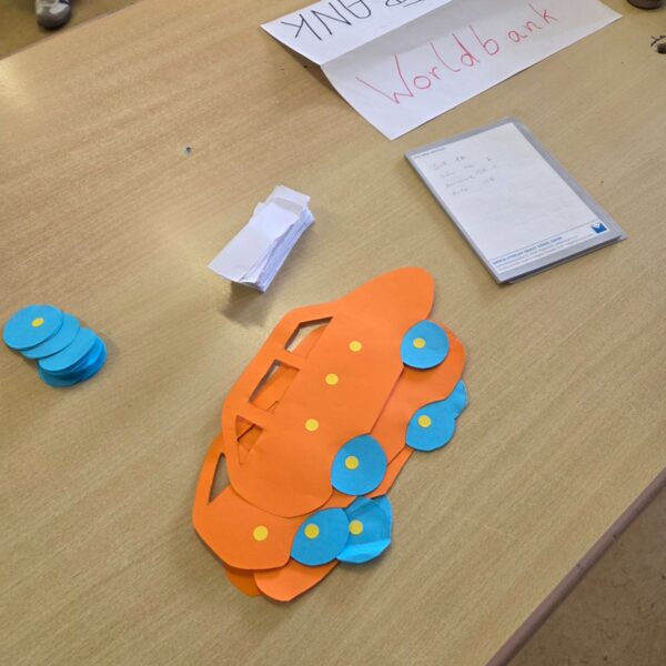 Anschließend durften die Schüler in einem Planspiel Autos herstellen. Da sie unterschiedlichen Ländern zugeordnet waren, gab es auch sehr unterschiedliche Startbedingungen und Produktionsmöglichkeiten. Anhand des Spiels konnte man gut nachvollziehen, wie Welthandel funktioniert und das es nicht immer gerecht auf der Erde zugeht.