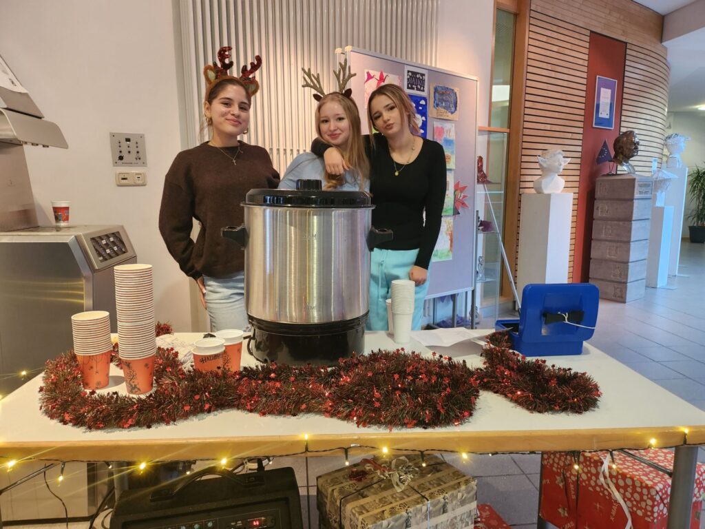 Am Tag zuvor waren die drei Schülersprecherinnen durch alle Klassenzimmer gegangen, um das schönste Weihnachtsklassenzimmer finden. Die vielen mit Kreativität geschmückten Räume machten die Entscheidung nicht leicht. Gewonnen hat schließlich die Klasse 7c, die sich über einen kostenlosen Punsch für alle freuen durfte.