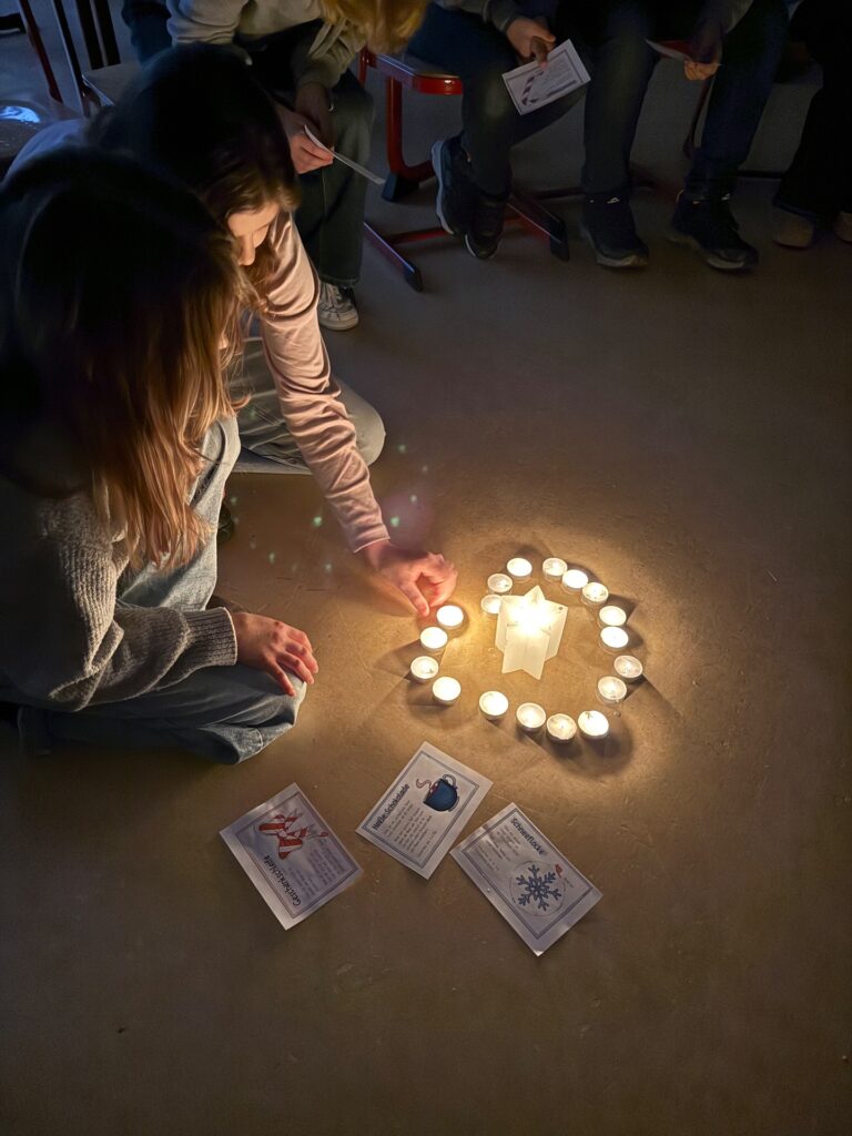 In der dritten Adventswoche drehte sich alles um das Thema Licht. Zu Beginn halfen winterliche Atemübungen dabei, zur Ruhe zu kommen und bewusst im Moment anzukommen. Unter der Frage „Wie kann ich in der Welt ein Licht sein?“wurde anschließend darüber nachgedacht, wie groß die Dunkelheit in der Welt manchmal erscheint – durch Sorgen, Konflikte oder persönliche Probleme. Gleichzeitig wurde deutlich: Schon kleine Gesten können Licht ins Dunkel bringen. Ein freundliches Lächeln, ein aufmerksames Wort oder ein Telefonat mit einer guten Freundin können Hoffnung schenken und Wärme weitergeben. Als Erinnerung erhielten die Schülerinnen und Schüler ein Teelicht, das symbolisch dafür steht, dass bereits eine kleine Flamme einen Unterschied machen kann.