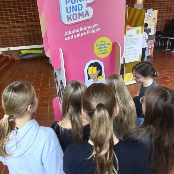 Am 22. und 27. Oktober besuchten wir, die Schülerinnen und Schüler der 7. Klassen, mit unserer Biologielehrerin Frau Hauck und unseren jeweiligen Klassenleitungen die Ausstellung „Ohne Punkt und Koma“, in der wir durch Informations- und Mitmach-Elemente für das Thema „Alkohol“ sensibilisiert wurden. Die Ausstellungssäulen beleuchteten in fünf Basismodulen die Themen: gesetzliche Grundlagen, Alkoholkonsum und seine Folgen, Wirkung von Alkohol, sozialer Druck sowie Erste Hilfe und Hilfsangebote.
