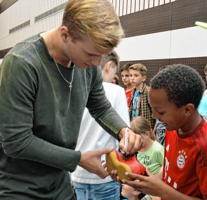 Zum Schluss drehte sich dann noch mal alles um Johannes Geis. Von jeder Klasse wurde ein Foto mit dem Fußball-Profi gemacht, die Jungen strahlten glücklich, wenn er sie im Vorübergehen abgeklatscht oder ihnen ein Autogramm schrieb.